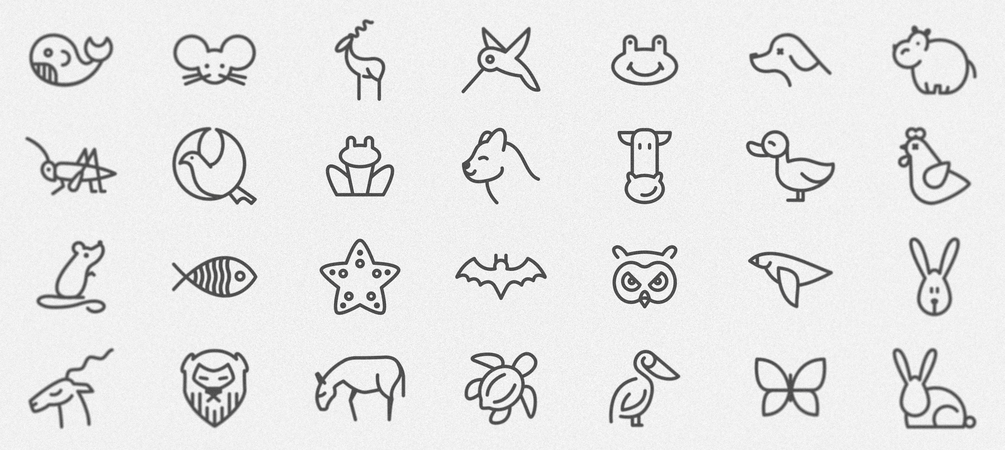 Icons: domestic and wild animals such as birds, horses, cats, rabbits, turtles, mouses, bats, frogs, snakes, sheeps, owls, hippos, elephants, some kind of insects, fishes and other stuff.