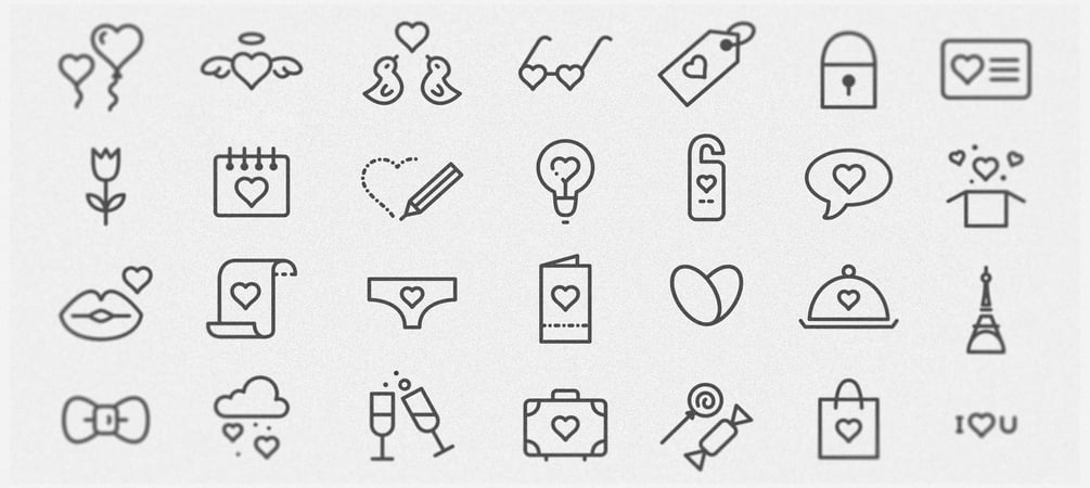 Icons: hearts, love, keys, locks, flowers, champagne, sweets, calendar, candles, dialogue, lips, kisses, birds, dresses, angels, letters and other stuff.